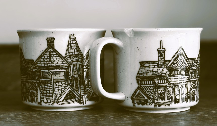 Picking up the cracked mug he turned to his discreet friend, “One of four. Simple. Decorated with a line drawing of a cityscape. They were from a long time ago. Before marriage. When I was on my own. My run at being a Bohemian in the twentieth century. Writing bad poetry, smoking pot, and drinking cheap wine while working somewhat irregularly at being a carpenter.” He laughed. “The love of my life back then was bartending her way to becoming an actress or an artist or something creative because that’s what we all did.”